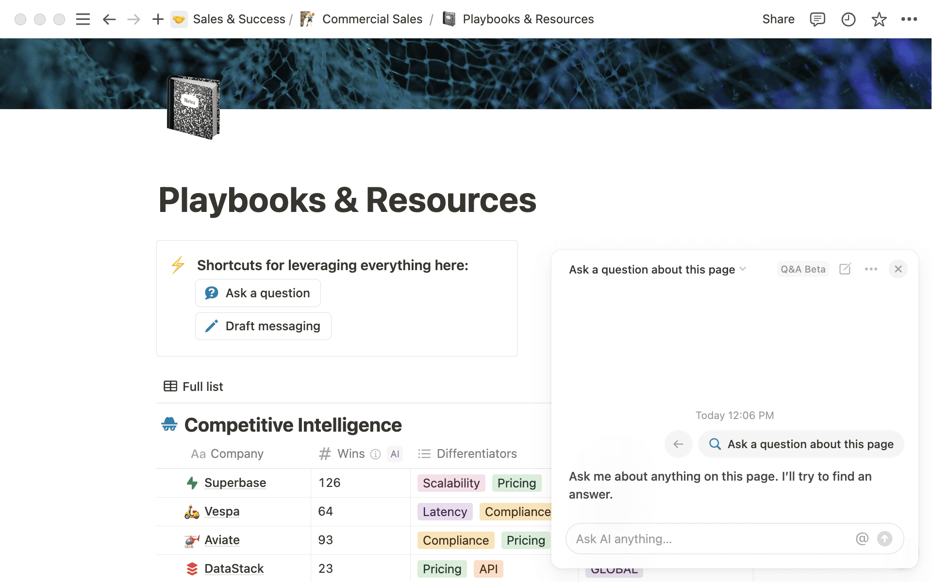 The sales team also leverages Notion to maintain up-to-date knowledge of complex technical details and industry information. With their technical documentation and internal enablement materials centralized in Notion, team members can access everything they need in one place and quickly answer customer questions during calls. They also use Notion AI to craft targeted, effective prospecting messages in seconds that synthesizes the latest knowledge from across their workspace and other tools connected to it.